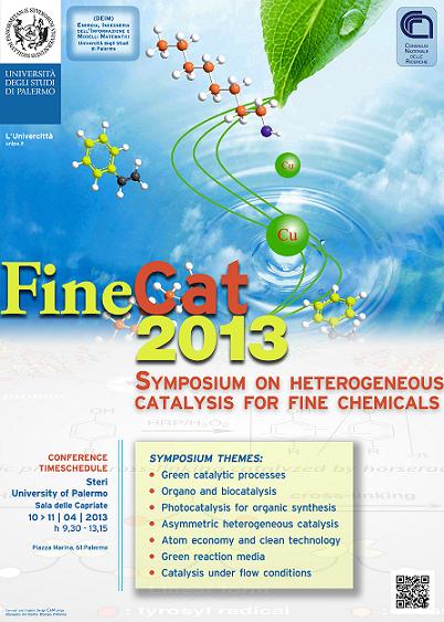 Chaired by Rosaria Ciriminna, the second “FineCat - Symposium on heterogeneous catalysis for fine chemicals" was held in Palermo, Italy, on April 10-11, 2013 in the splendid venue of the Steri Palace, hall of Palermo's University Rectorate. The Symposium was dedicated to the memory of University of Palermo's Prof. Ines Donato, and to her long-term support of and dedication to Palermo's chemistry students.